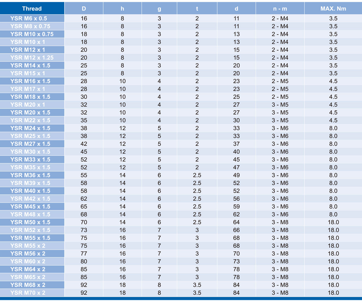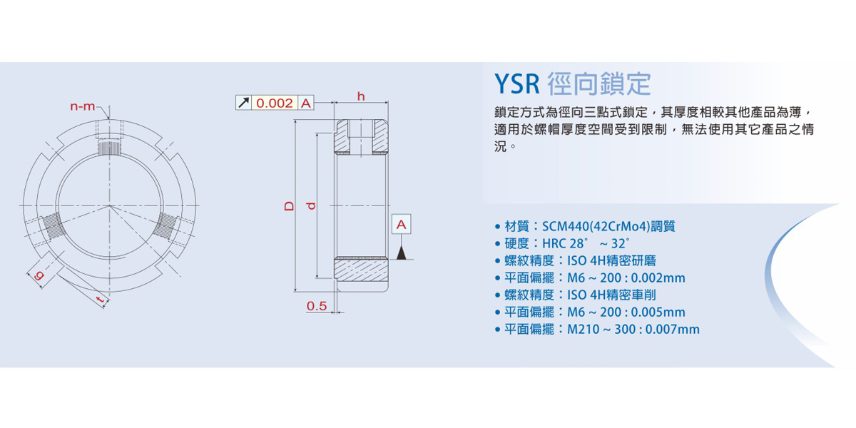 鎖定方式為徑向三點(diǎn)式鎖定,其厚度相較其他產(chǎn)品為薄,適用于螺帽厚度空間受到限制,無法使用其它產(chǎn)品之情況。