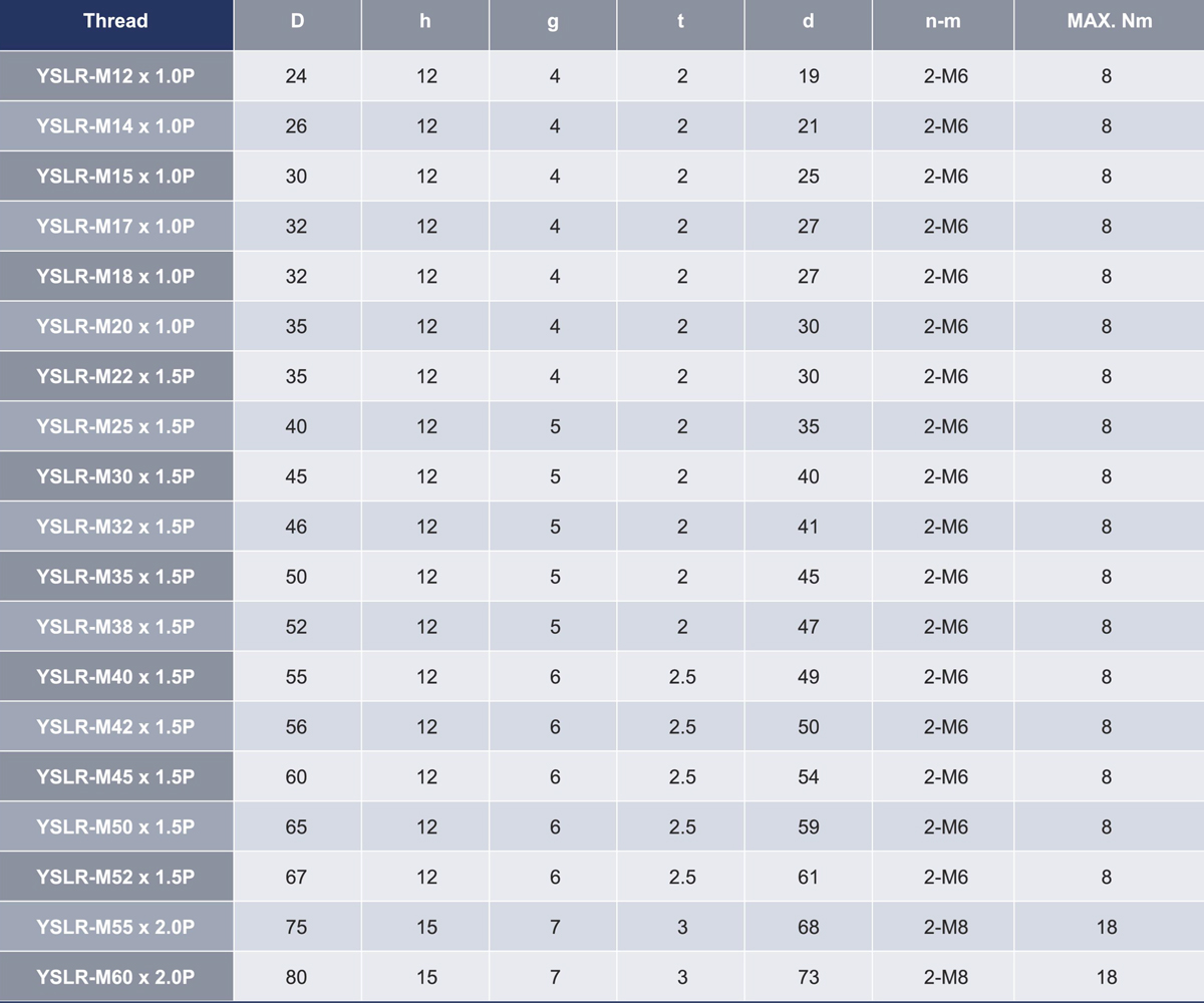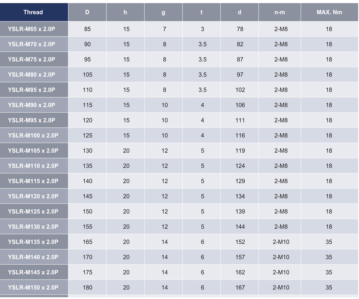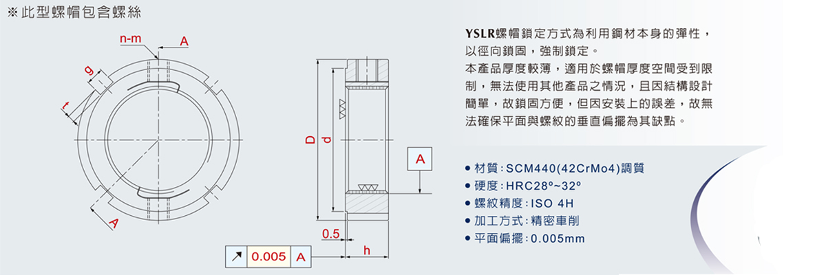 YSLR螺帽鎖定方式為利用鋼材本身的彈性,以徑向鎖固,強(qiáng)制鎖定。 本產(chǎn)品厚度較薄,適用于螺帽厚度空間受到限制,無法使用其他產(chǎn)品之情況,且因結(jié)構(gòu)設(shè)計(jì)簡單,故鎖固方便,但因安裝上的誤差,故無法確保平面與螺紋的垂直偏擺為其缺點(diǎn)。