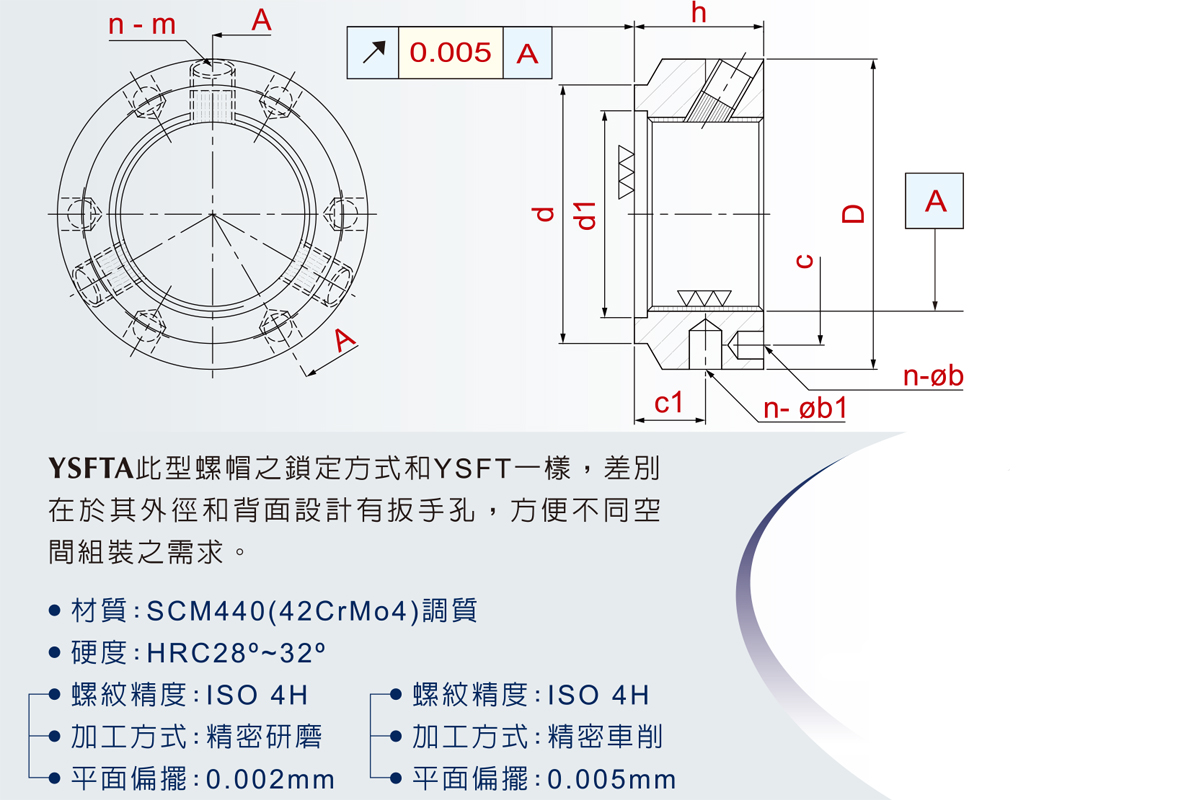 YSFTA此型螺帽之鎖定方式和YSFT一樣,差別在于其外徑和背面設(shè)計有扳手孔,方便不同空間組裝之需求。