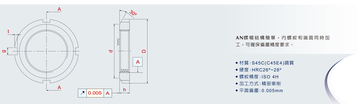 AN螺帽結(jié)構簡單,內(nèi)螺紋和端面同時加工,可確保偏擺精度要求。