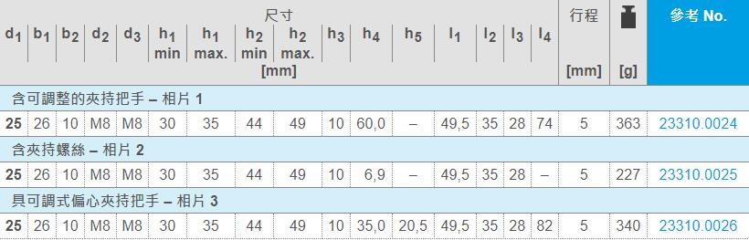 ? 借由夾持螺絲、可調(diào)節(jié)夾持把手或可調(diào)節(jié)偏心快速夾持把手進(jìn)行快速手動(dòng)夾持